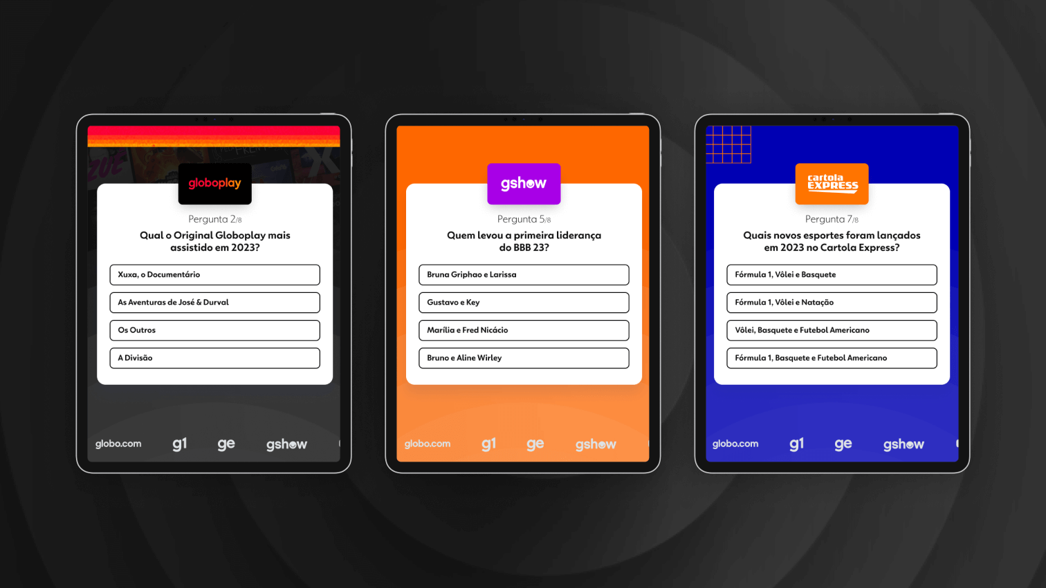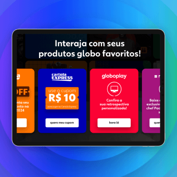 Para esse job, contemplamos todos os produtos Globo: Globoplay, globo.com, g1, ge, gshow, Cartola, Cartola Express e Receitas. A ideia foi utilizar os destaques de 2023 de cada frente para a elaboração do quiz e, com isso, criar essa atmosfera de retrospectiva.